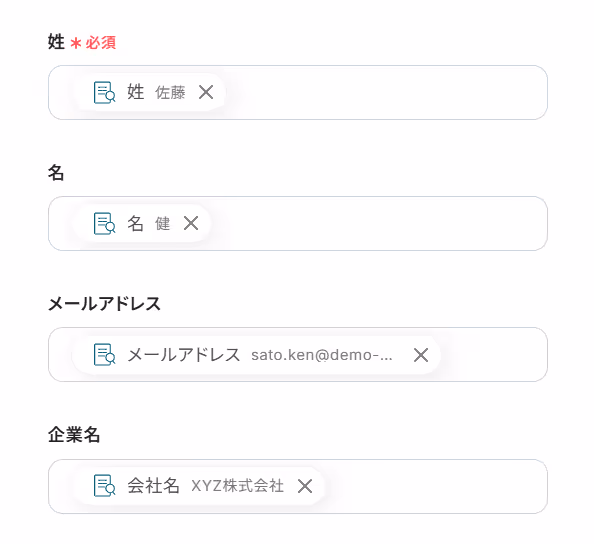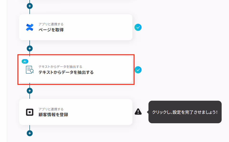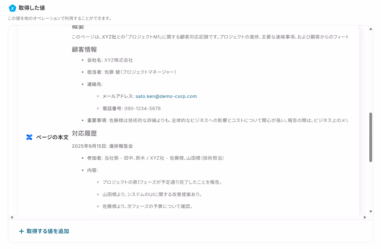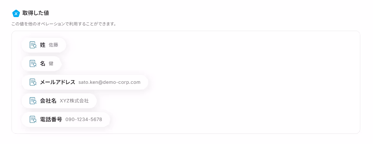 この連携にはAIによる抽出処理を含むため、ページ本文から顧客名や連絡先といった必要な情報だけを抜き出すことができ、<span class="mark-yellow">転記作業における入力ミスを防げます。</span>