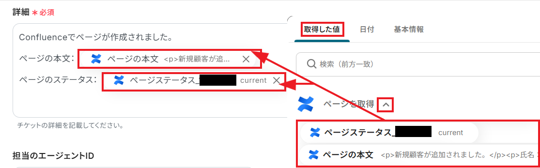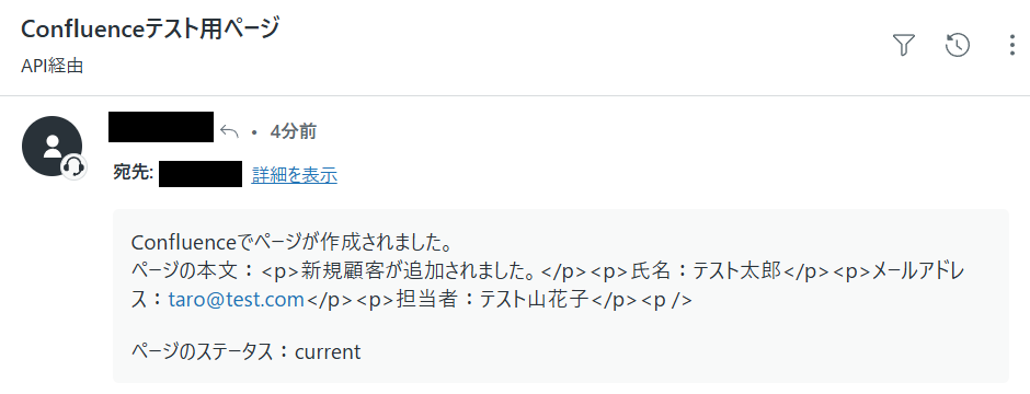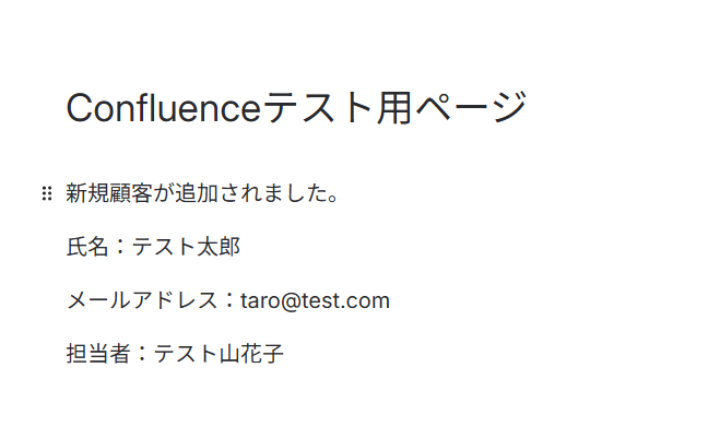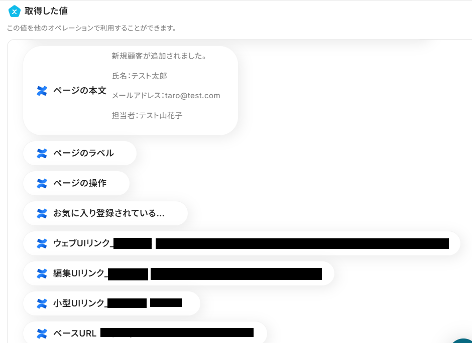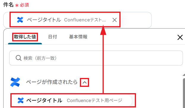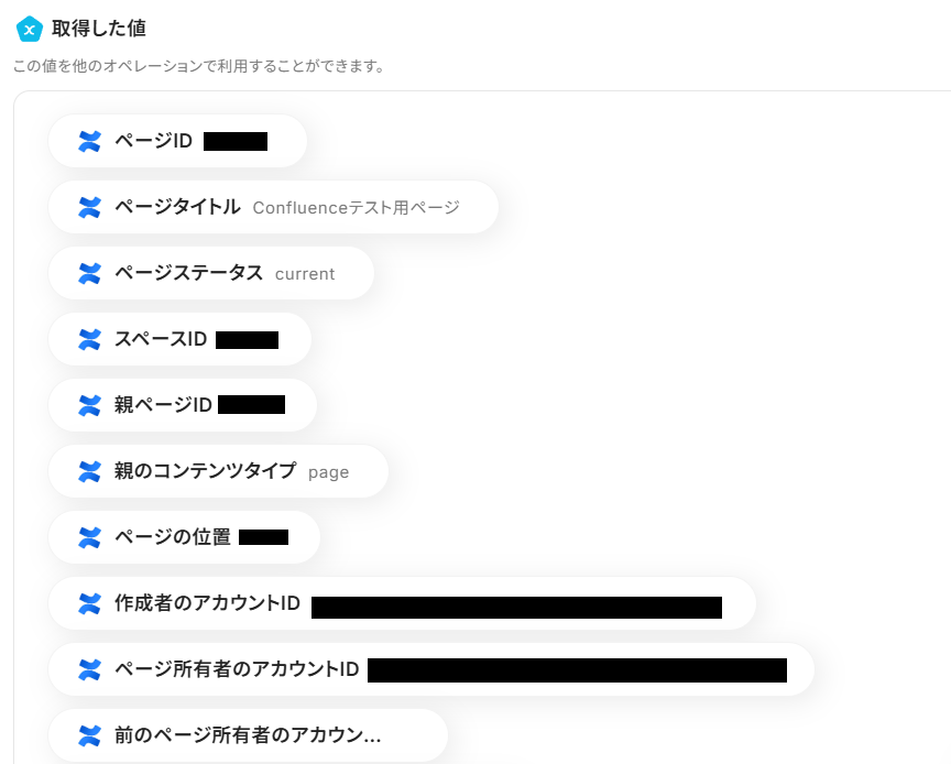 「取得した値」として、Confluenceで作成したページの情報が反映されていれば成功です!
