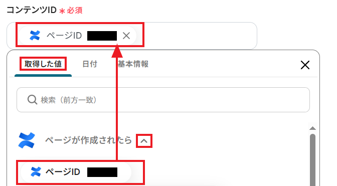 「コンテンツID」には、トリガーアクションで取得した値の中から「ページID」を設定しましょう。