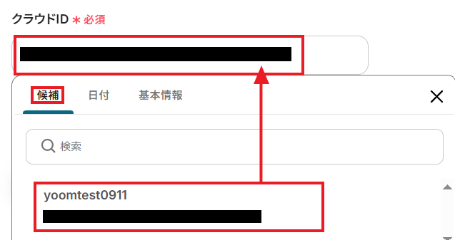 「クラウドID」は、入力ボックスをクリックして表示される「候補」から任意のIDを選択してください。