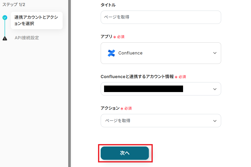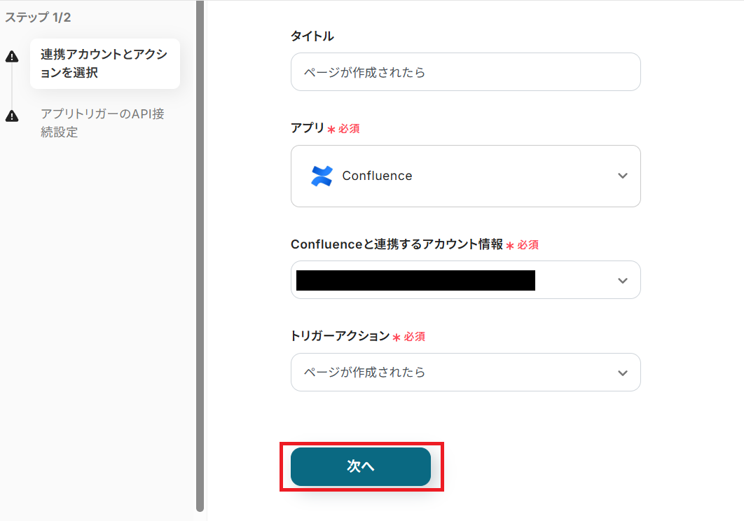 タイトルを任意で設定し、Confluenceと連携するアカウントやアクション内容を確認したら「次へ」を押してください。