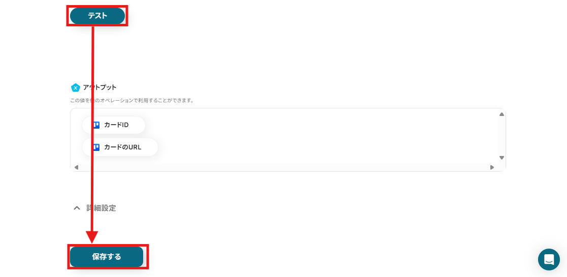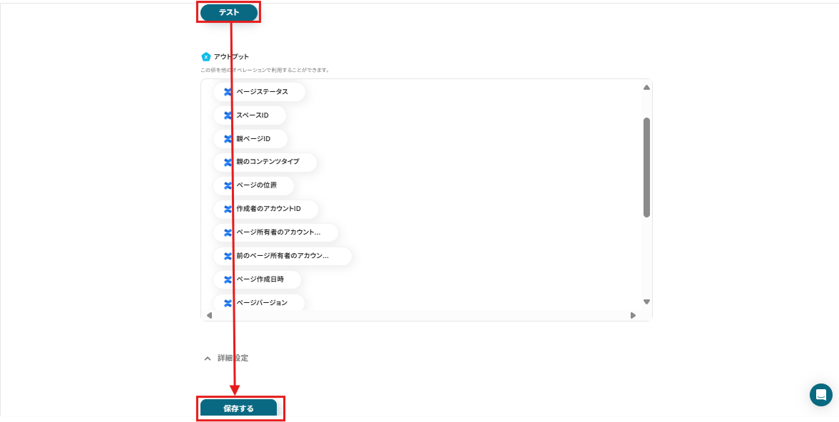 テストを実行すると、先ほど作成したページの情報がアウトプットとして取得されるので「保存する」ボタンをクリックしてください。