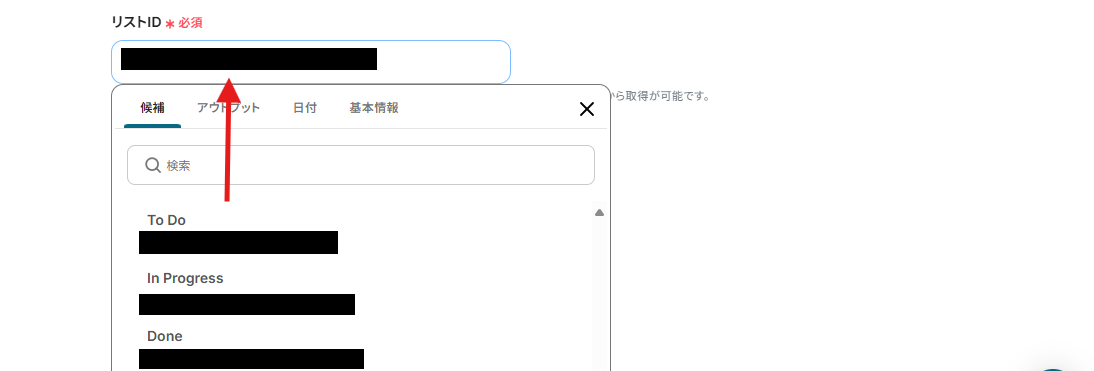 リストIDは、枠内をクリックして表示される候補から任意で選択してください。