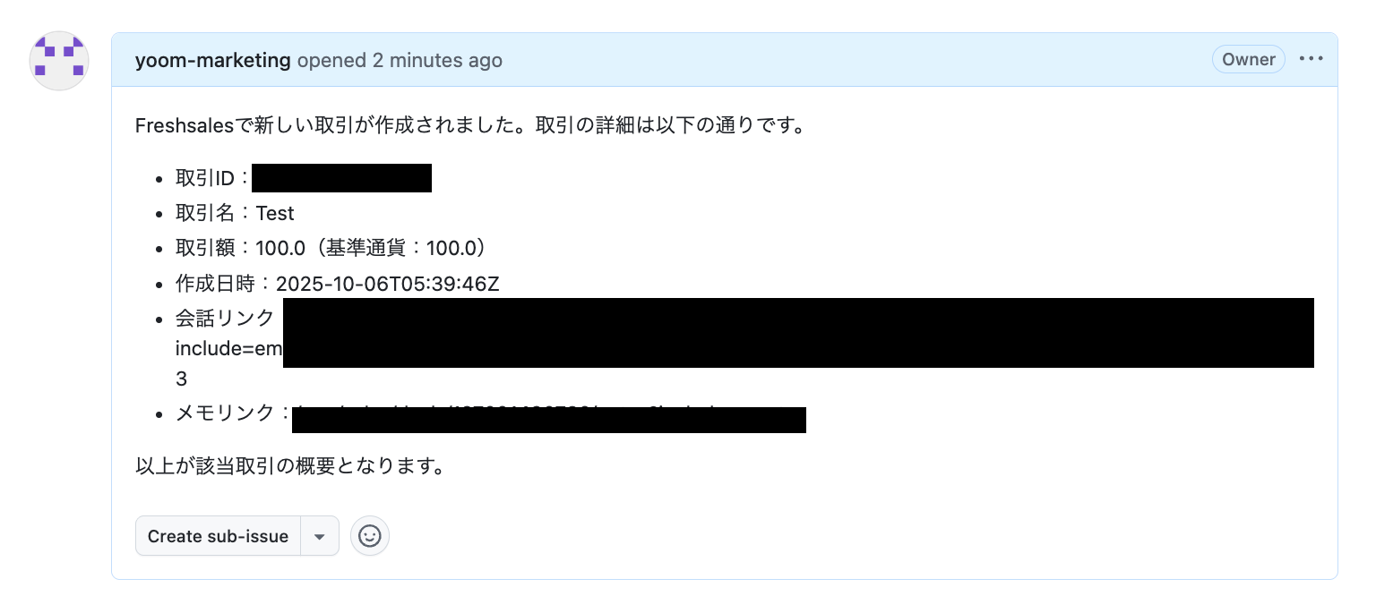 Freshsales上の取引ステータスや顧客とのやり取りなど、更新された情報をその都度GitHubの関連Issueにコメントとして手動で追記する作業は、非常に煩雑であり、スムーズな情報共有を妨げる一因となります。