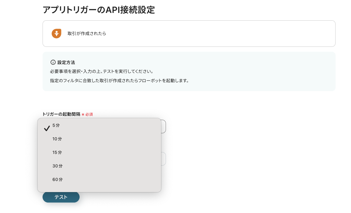 なお、Yoomのフローボットを動かす引き金となるアクションのことを「アプリトリガー」と呼びます。まずはこのトリガーの設定を行いましょう。「取引が作成されたら」をクリックしてください。
