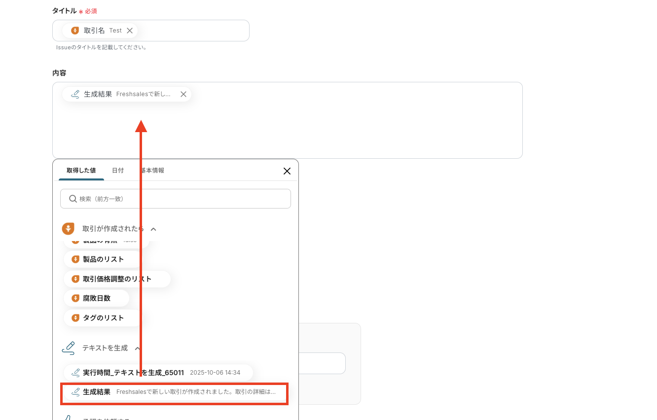 この設定ではFreshsalesの取引を簡潔にまとめGitHubのIssueを作成できるよう、AIで要約を行います。