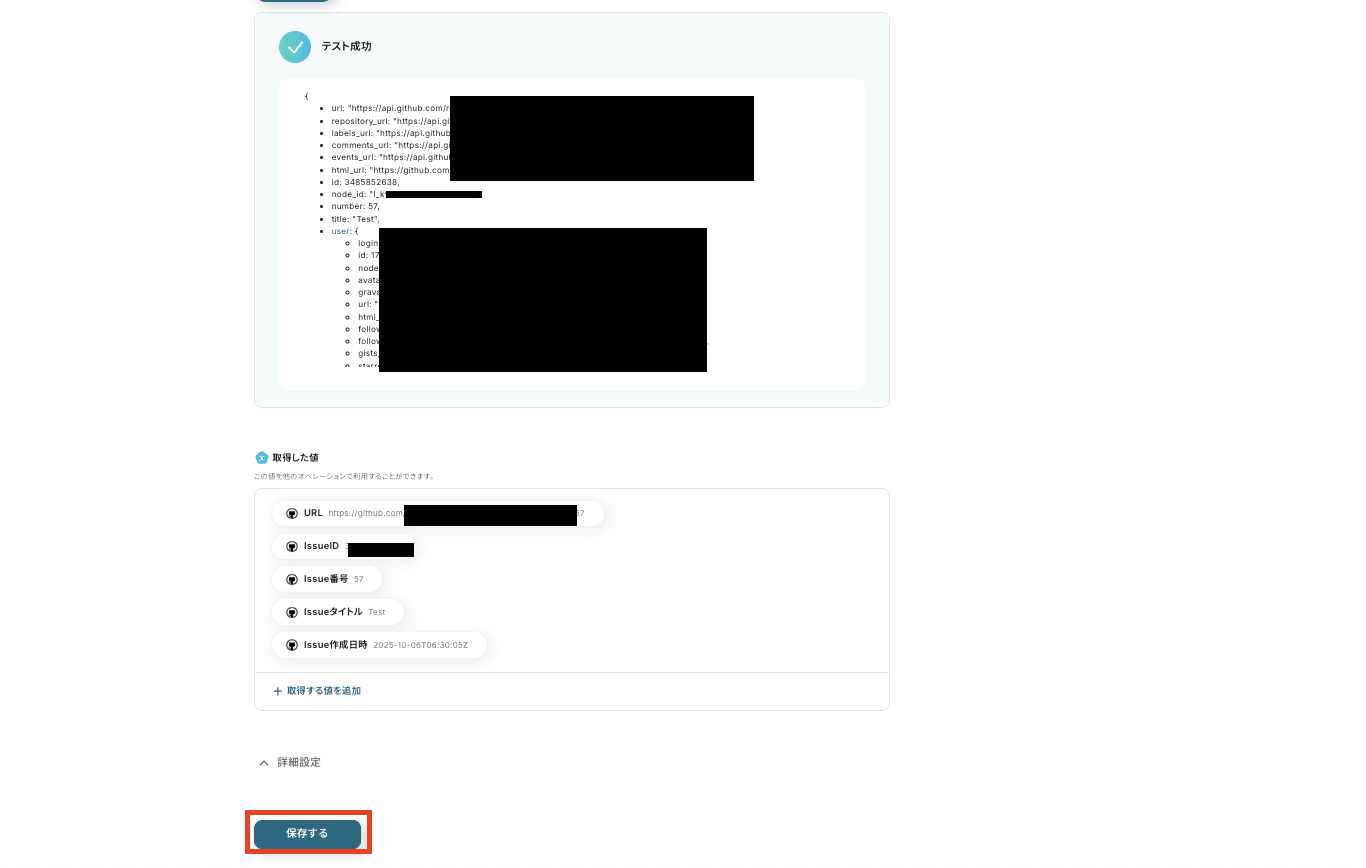 設定後、[テスト]を押しましょう。テストに成功すると、指定した内容で情報を取得できました!