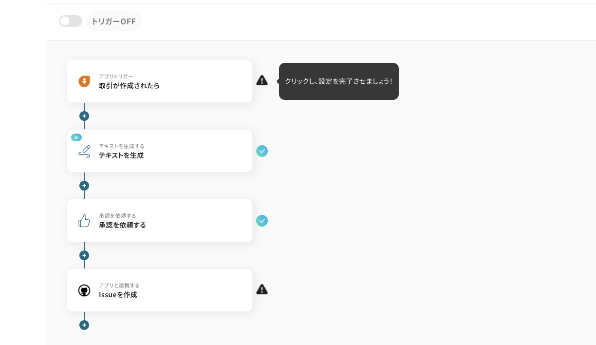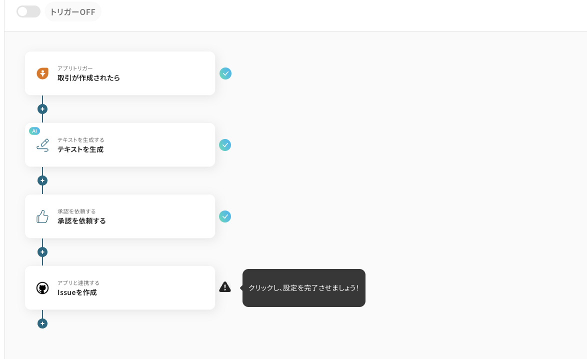 今回は「Freshsalesで取引が作成されたらAIでテキストを生成し、承認後にGitHubでIssueを作成する」フローを作成していきます!