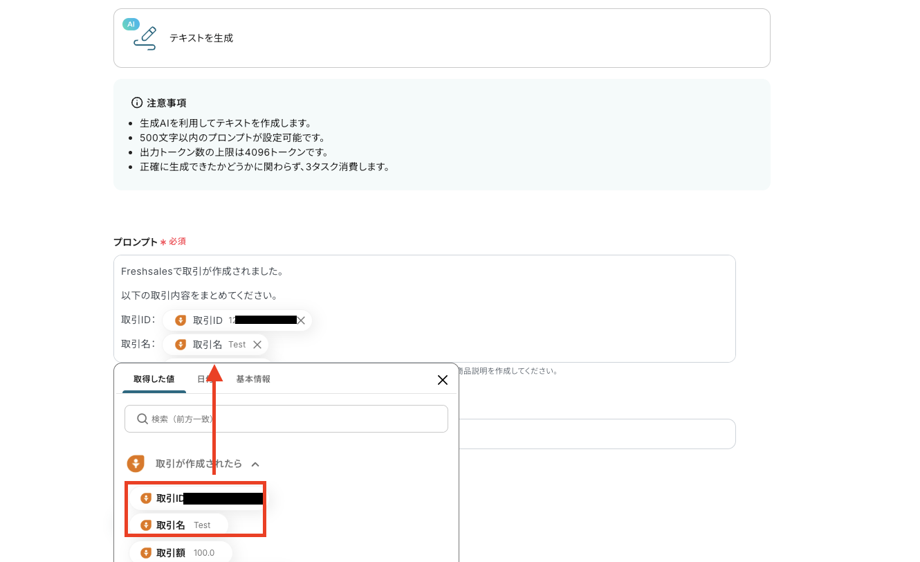 今回は前ステップで取得した値を引用し以下のようにプロンプトを設定しました。取得した値は入力ボックスをクリックすることで選択可能です。