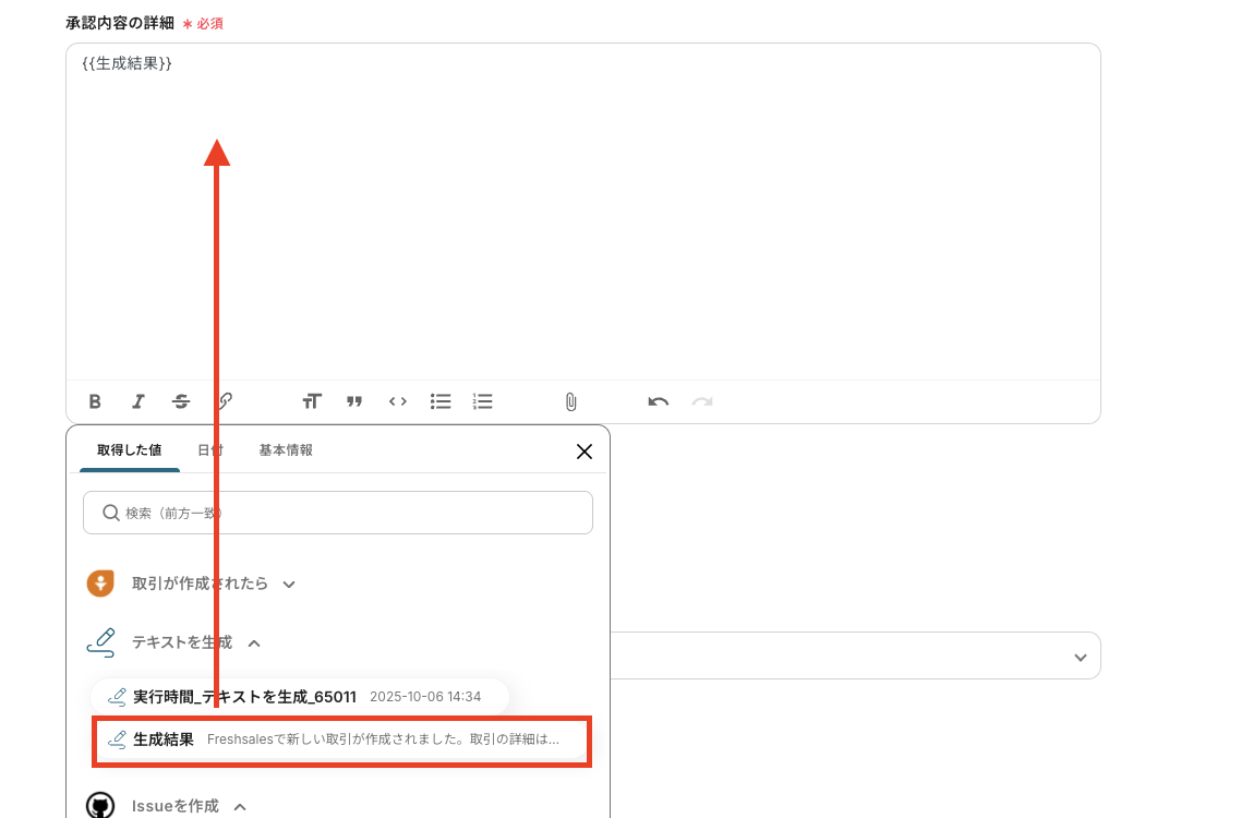 「承認内容の詳細」は、生成された値が引用されているかを確認してくださいね。