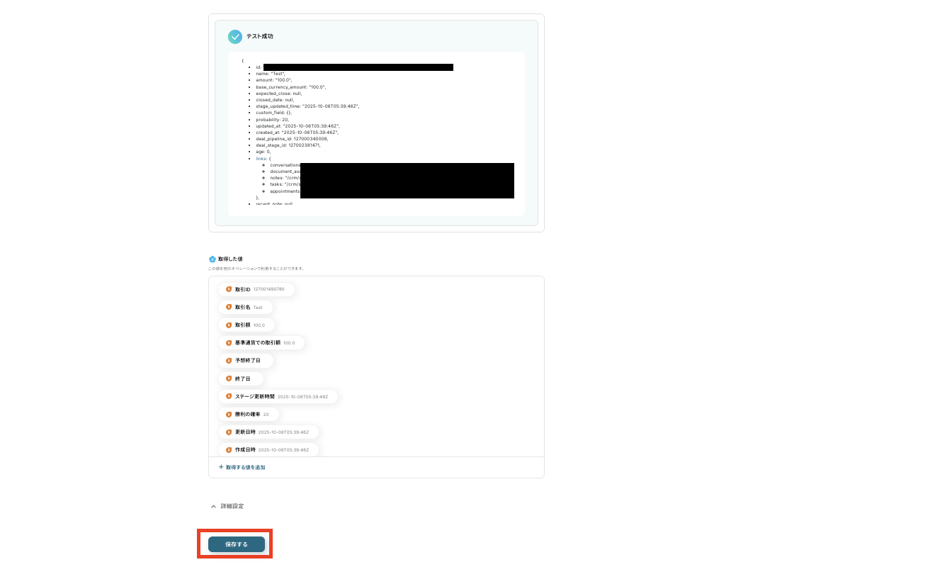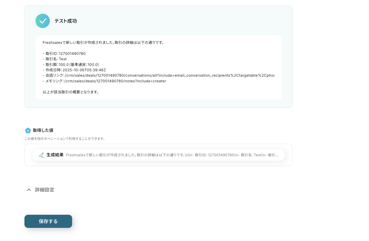 テストが成功するとテスト成功画面と取得した値が表示され、Freshsalesのデータが確認できます。「保存する」をクリックして完了です!