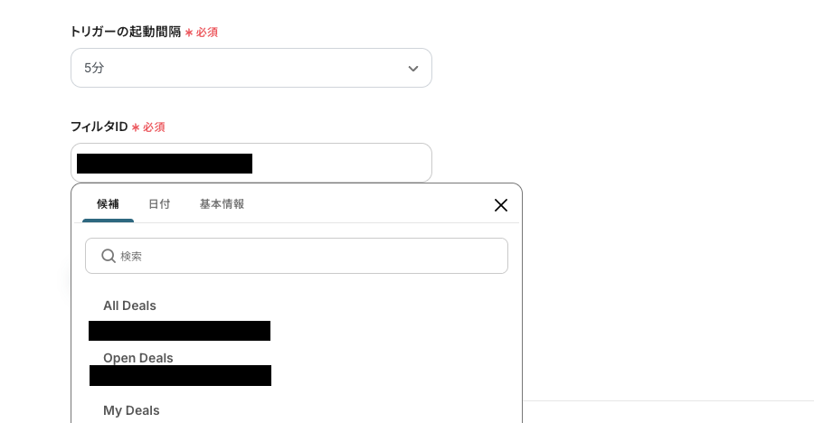 「フィルタID」は、入力バーをクリックすると『候補』に連携したアカウントに基づいた情報が表示されます。ここから該当するものを選択しましょう。