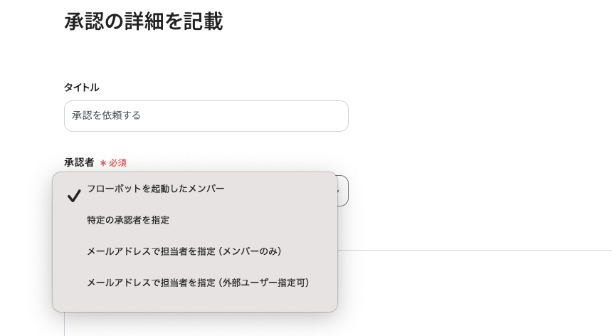 各項目は直接入力したりプルダウンから選択することができます。承認者は特定の人物にし、メール送信することも可能です。