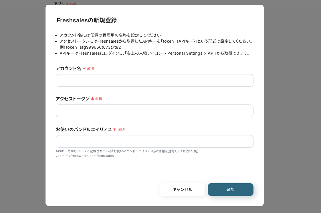 Yoomの画面に戻り、「アクセストークン」APIキーを、「お使いのバンドルエイリアス」にコピーしたバンドルエイリアス情報を貼り付けて[追加]をクリックしましょう。2つ目のFreshsalesの登録も完了です!