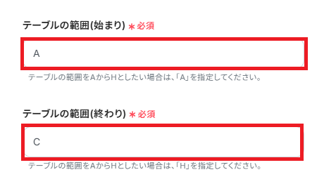「テーブルの範囲(始まり)」と「テーブルの範囲(終わり)」は、作成したシートのテーブルの範囲を手入力してください。 今回は用意したGoogle スプレッドシートに基づき、A列のNoからC列の短縮URLまでとしています。