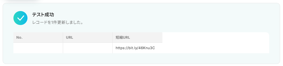 テストが成功すると下記のようなテスト成功画面と取得した値が表示されます。これらにはそれぞれGoogle スプレッドシートのデータが表示されているので、用意したGoogle スプレッドシートのデータで間違いないか確認しましょう。 なお、取得した値はこのあとの設定で活用し、Bitlyと連携を進めていきます。