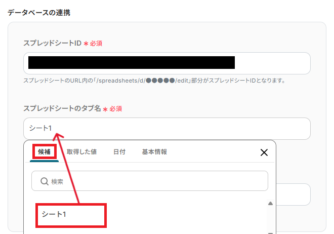 「スプレッドシートID」と「スプレッドシートのタブ名」を、ステップ3と同様に候補から選択、または指定してください。