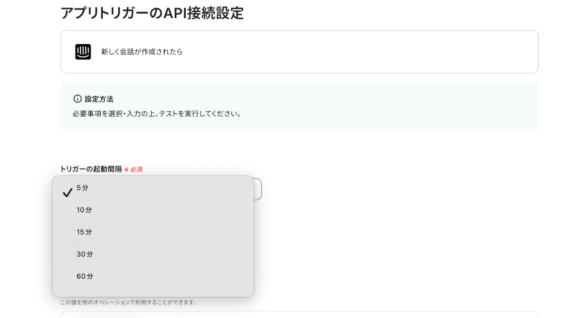起動間隔とは、トリガーとなるアクションの何分後にフローボットを起動するか、というものです。トリガーの起動タイミングは、5分、10分、15分、30分、60分のいずれかで設定できます。