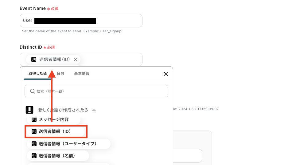 「Distinct ID」は、以下の画像のように前ステップで取得した値を設定しましょう。