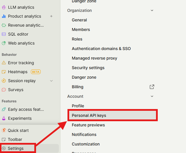 「API Key」はPostHogのアカウント設定の個人APIキーセクションから取得可能です。