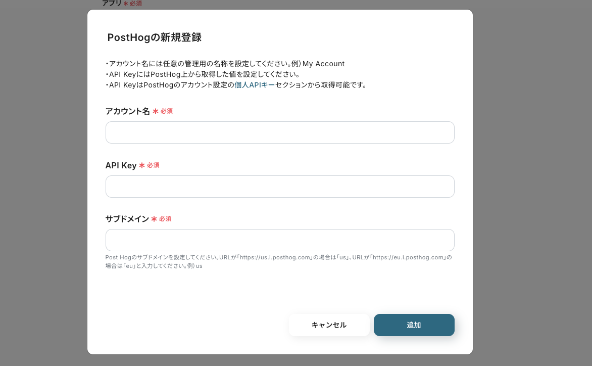 「サブドメイン」は、PostHogのサブドメインを設定してください。(URLが「https://us.i.posthog.com」の場合は「us」)