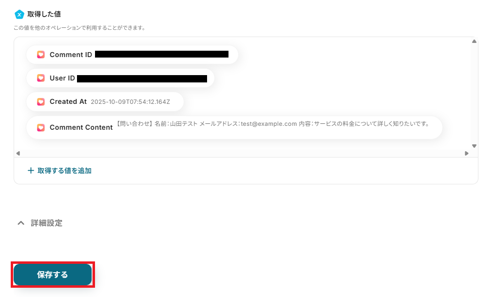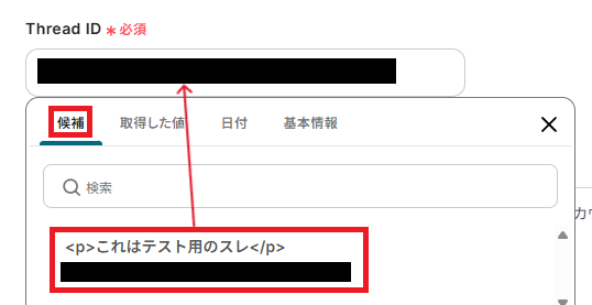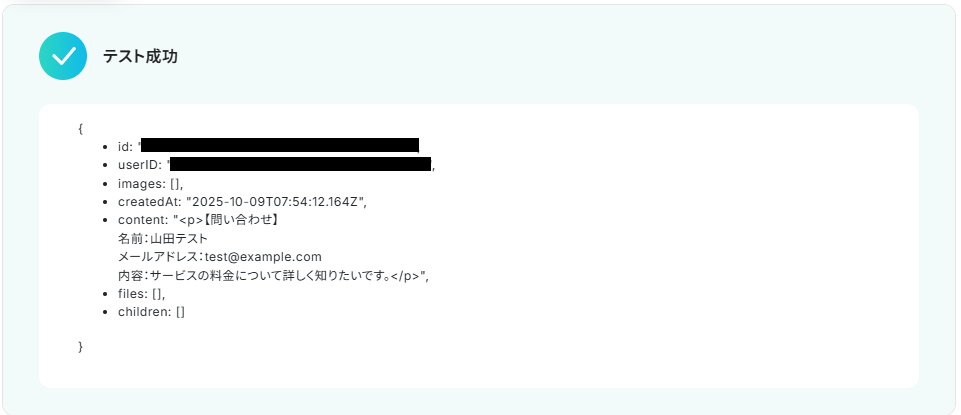 準備が完了したら、Yoomに戻り「テスト」を実行しましょう。