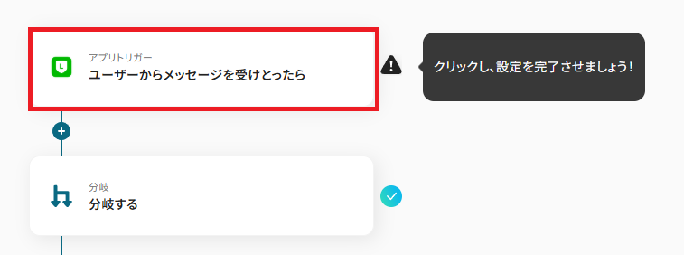 受信したメッセージの内容に特定のキーワードが含まれている場合だけ処理を進めるよう、分岐条件を指定していきます。