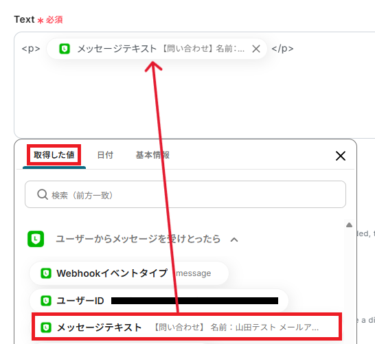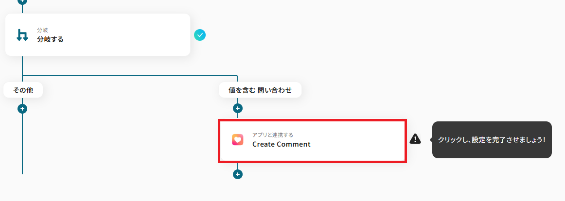 メッセージに含まれる「問い合わせ」というキーワードは、次の分岐設定ステップで利用され、LINE公式アカウントメッセージ内にこのキーワードが含まれている場合にのみ、HeartbeatでCommentを作成する条件として機能します。