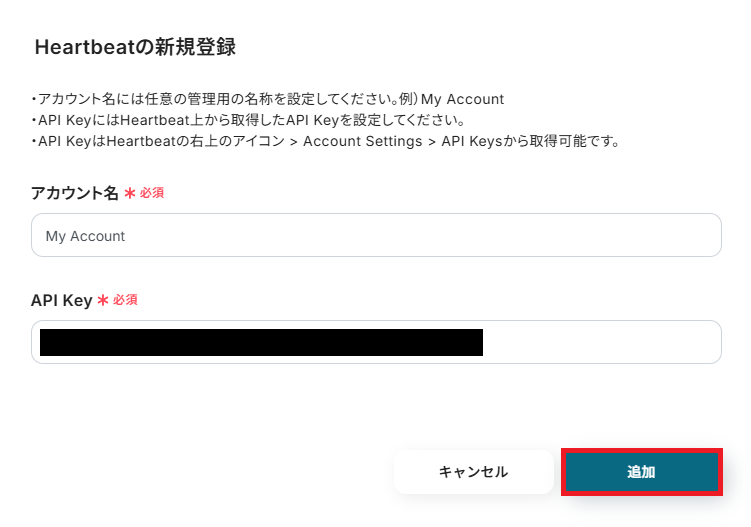 以下の画面が表示されるので、「アカウント名」と「アクセストークン」を入力し追加を押してください。
