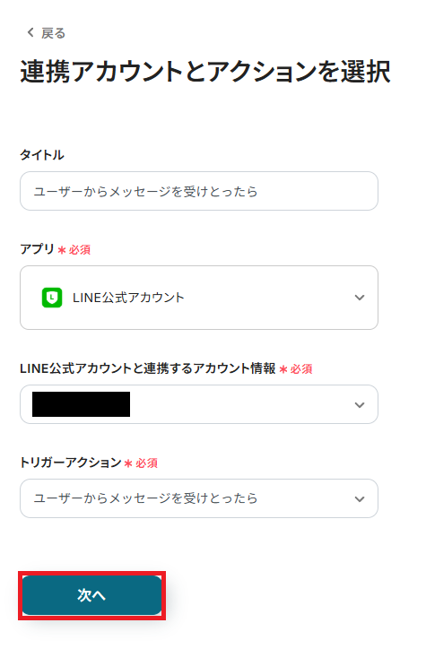 LINE公式アカウントと連携するアカウントに間違いがないかを確認し、「次へ」をクリックしてください。