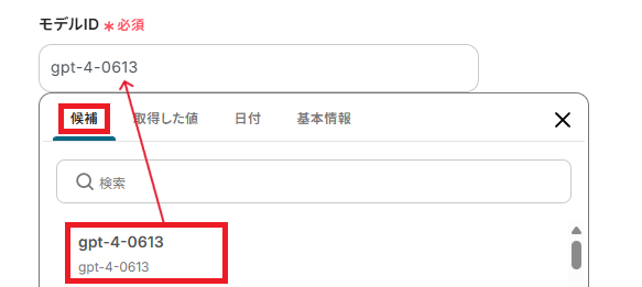 入力欄をクリックすると連携済みのOpenAIアカウントから利用可能なモデルが候補として表示されます。