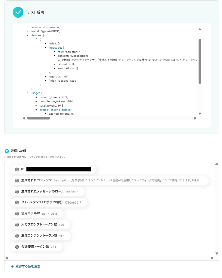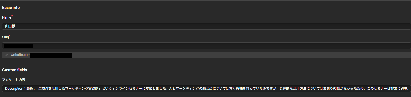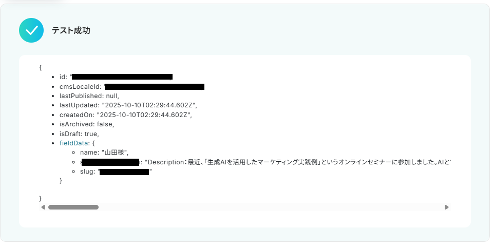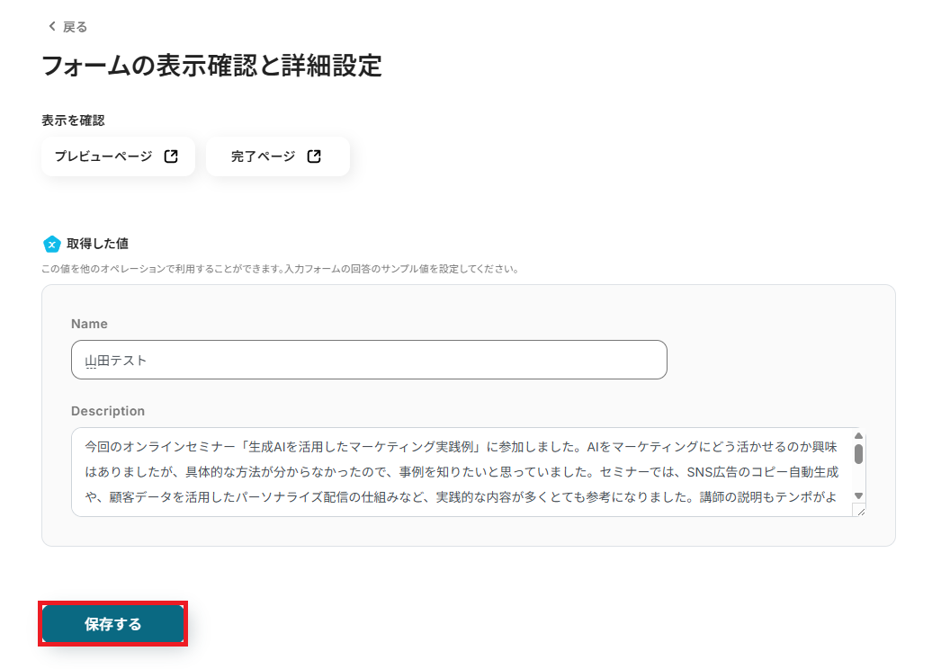 ここで各項目に仮のテスト回答を入力していきましょう。取得した値に入力したテスト回答を基にOpenAIなどでコンテンツを生成します。