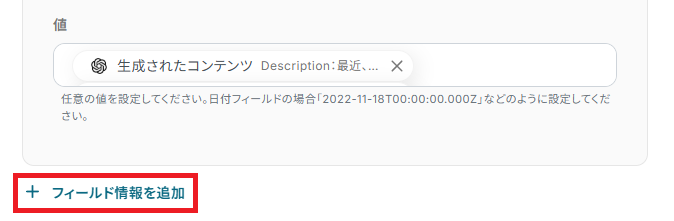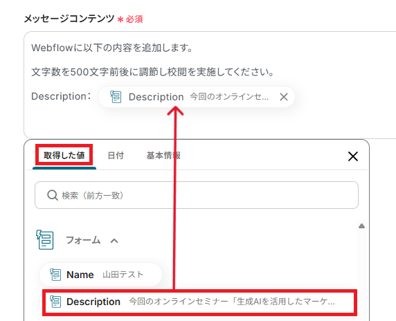 「メッセージコンテンツ」は、フォームからの回答データを用いてどのようなコンテンツを作成したいのかプロンプトを設定しましょう。