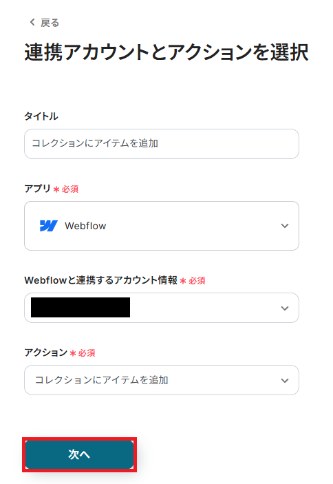Webflowでコレクションのアイテムが作成されたらNotionに追加するフローです。