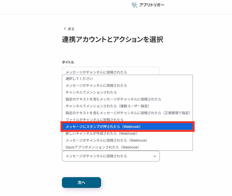Slack連携アカウントを選び、「次へ」をクリックします。