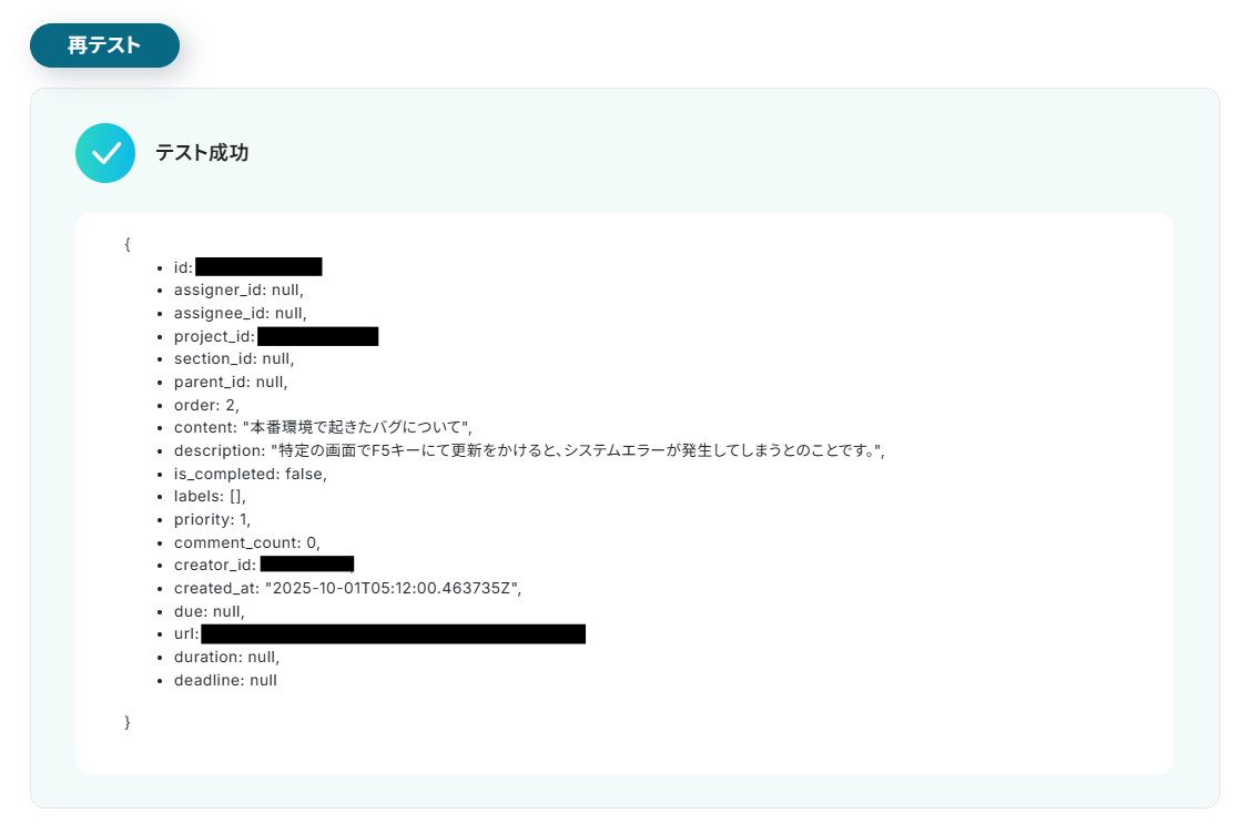 - Todoistのタスク作成アクションでも同様に、プロジェクトやタスクのコンテンツなどの各フィールドに、Google スプレッドシートの値を引用して自由に設定できます