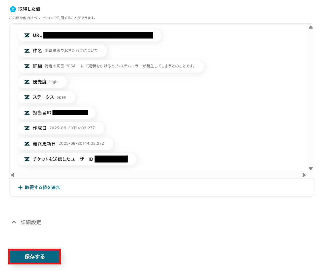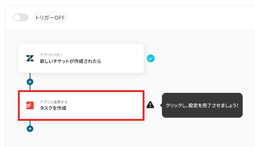 - 最後に、オペレーションでTodoistの「タスクを作成」アクションを設定し、Zendeskから取得したチケット情報を基にタスクを作成します