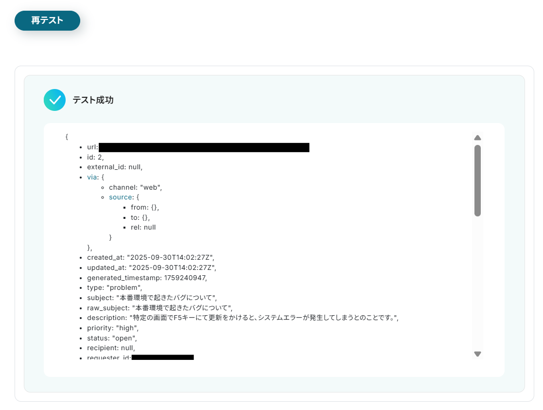 - 最後に、オペレーションでTodoistの「タスクを作成」アクションを設定し、Zendeskのチケット情報を基にタスクを作成します。