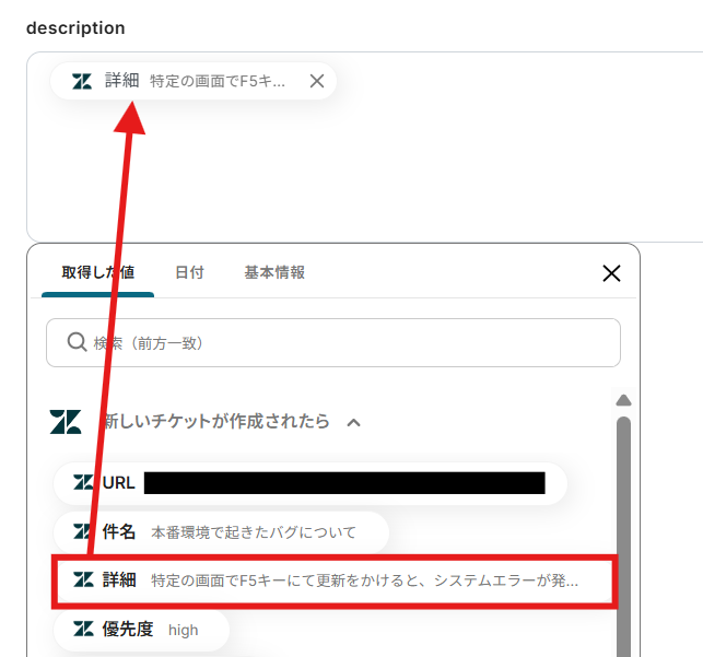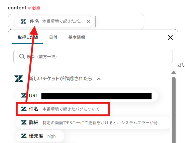 - Todoistでタスクを作成するアクションでは、Zendeskのトリガーから取得したチケットの件名や内容などを引用し、タスクのタイトルや説明に自由に設定できます