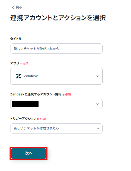 - Zendeskと連携するアカウント情報:フローと紐づけるアカウントを選択してください。