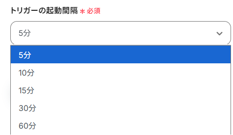 - トリガーの起動間隔は5分、10分、15分、30分、60分の間隔で選択できます。
