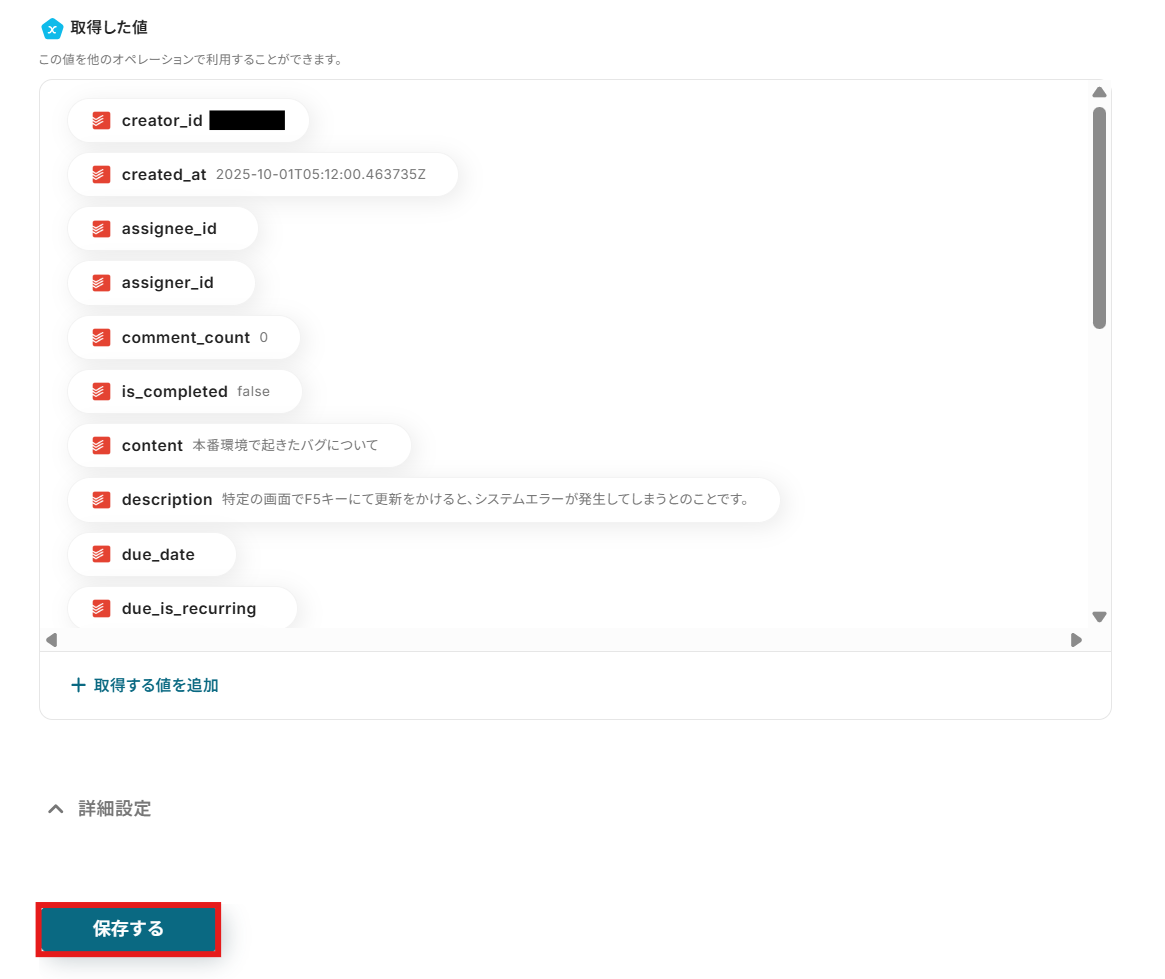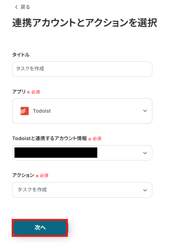 - 最後に、オペレーションでTodoistの「タスクを作成する」アクションを設定し、前のステップで取得した情報をもとにタスクを作成します。