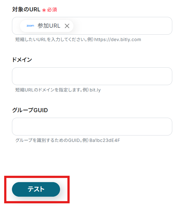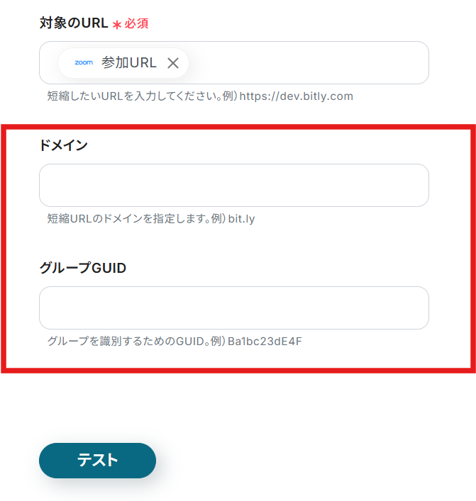 - Bitlyでリンクを短縮するアクションでは、対象のURLに加え、使用するドメインやグループGUIDなどを任意で設定することが可能です。