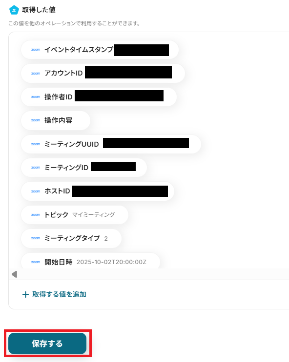 テストボタンをクリックしましょう。うまく接続できていればテスト成功画面と同時に取得した値が表示され、Zoomのデータが確認できます。