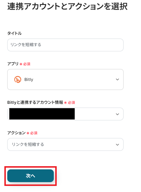 - 次に、オペレーションでBitlyの「リンクを短縮する」アクションを設定し、取得したレコード内のURL情報を短縮します。