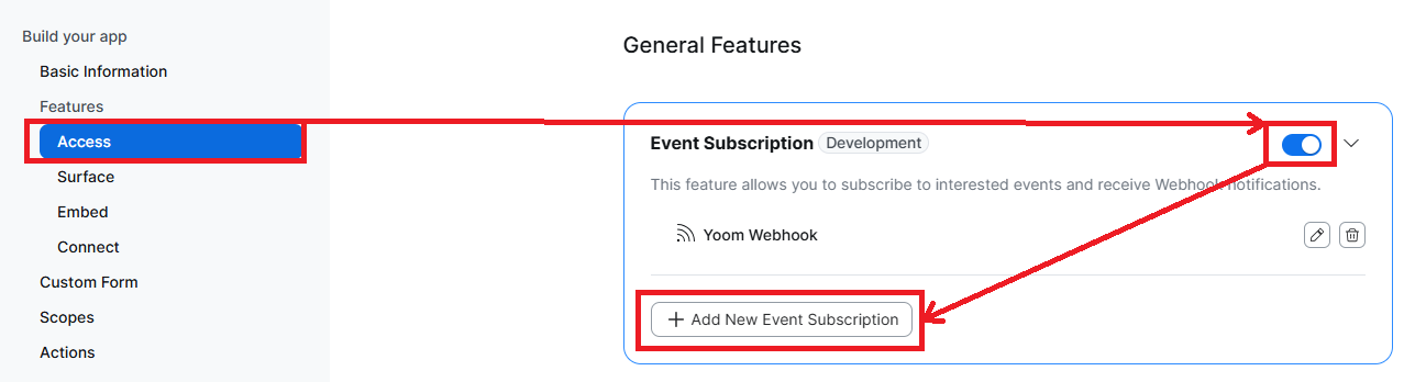 Webhookの設定を行います。ZoomのApp Marketplaceで、マイアプリ連携時に作成したZoomアプリページを開き、サイドメニューの「Access」を選択し、Event SubscriptionのトグルをONに変更します。