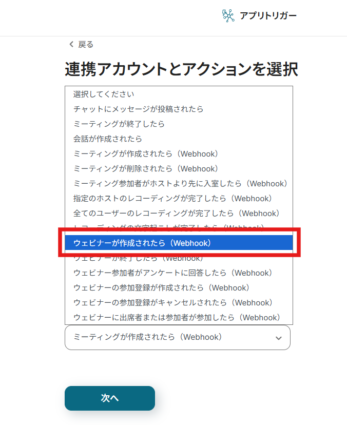 Webhookの設定時、「ウェビナーが作成されたら」を選択すれば同じような連携が可能です。