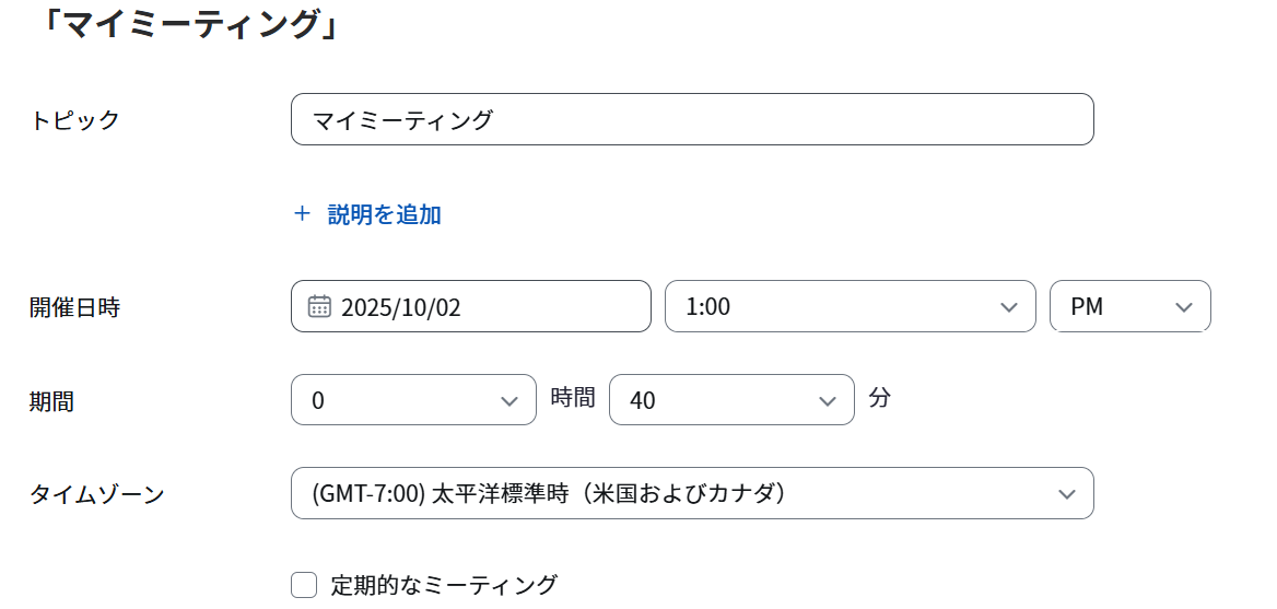 次に連携テストを行います。トリガー条件を満たすためにZoomでテストミーティングを作成しましょう。