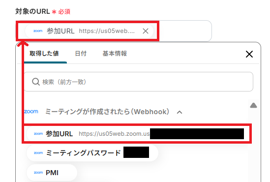短縮したい対象のURLを前段階で取得した値から入れていきます。参加URLが該当するので、参加URLを選択しましょう。