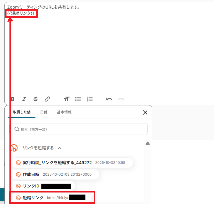 - Bitlyのアクション設定では、Zoomから取得したミーティング情報などを変数として利用したり、固定値を入力したりして、任意の項目を設定できます。